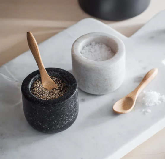Beautifully smooth with a contrast of colours the Brompton Salt and Pepper Pots are the perfect addition to any dining table. The deep polished Granite stores pepper whilst the neutral marble can house crisp sea salt. Buy here.