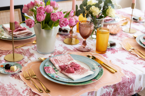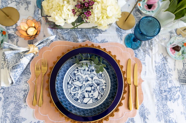 This beautiful tablescape is inspired by beauty and nature from different countries around the world including France, Italy, Portugal, Japan and Bali. Celebrating Japanese Flora with our stunning blue Flora Japonica dinner plates to our much-loved Toile de Jouy table linen. Bringing in pink and peach hues to the blue canvas to complete and soften the look.