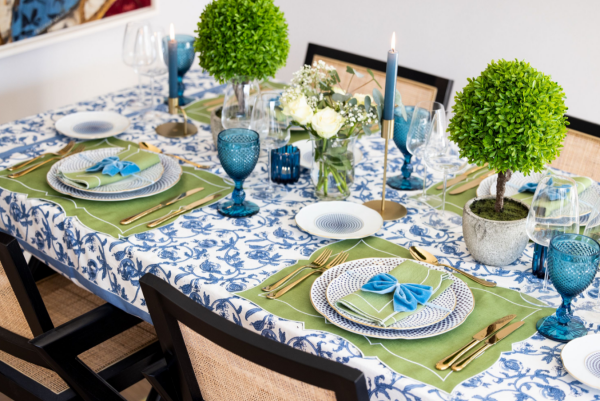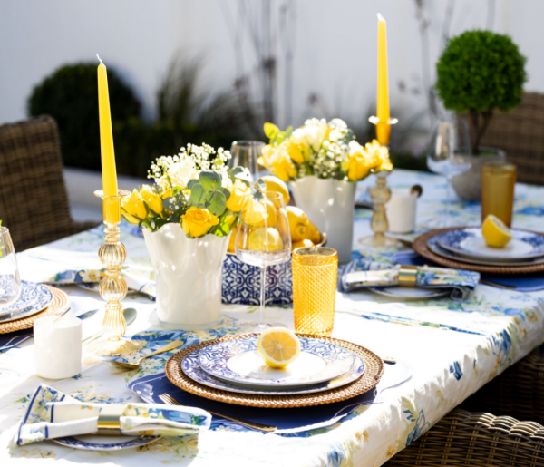 This beautiful tablescape collection is inspired by the summer, lemon trees and Portuguese mosaic tiles glistening in the sun. The Blue Legacy dinner set really champions this tablescape with beautiful table linen bringing in blue and yellow tones.